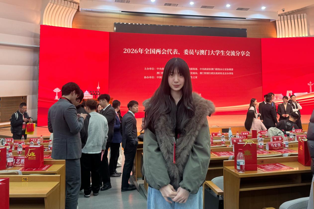 3月9日,应中央政府驻澳门联络办公室北京联络部邀请,首都经济贸易大学澳门籍学生詹嘉琪与港澳台办公室负责人刘文川一同前往中国人民大学,出席了在逸夫会堂第一报告厅举行的“2026全国两会代表、政协委员与澳门大学生交流分享会”。