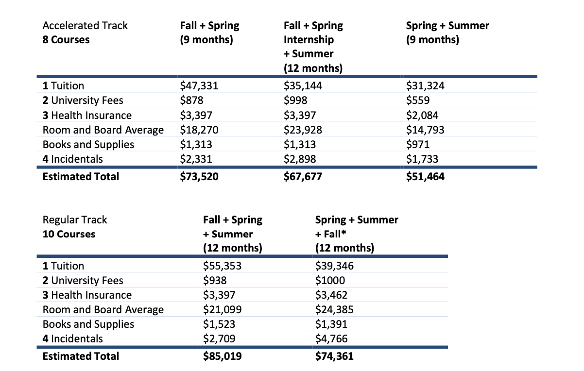 一、费用(2023-2024年研究生双学位项目费用标准;美元)