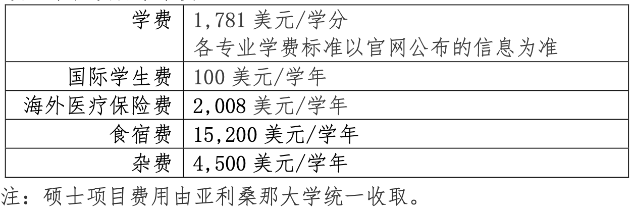 以下为亚利桑那大学官方公布的国际学生收费标准: