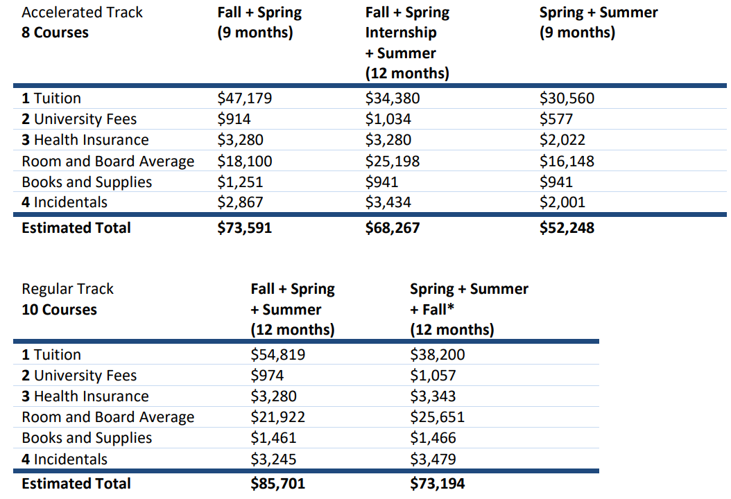 一、费用(2023-2024年研究生双学位项目费用标准;美元)