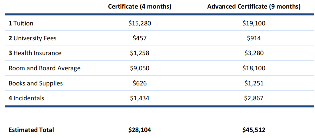 一、费用(2023-2024年研究生证书项目费用标准;美元)